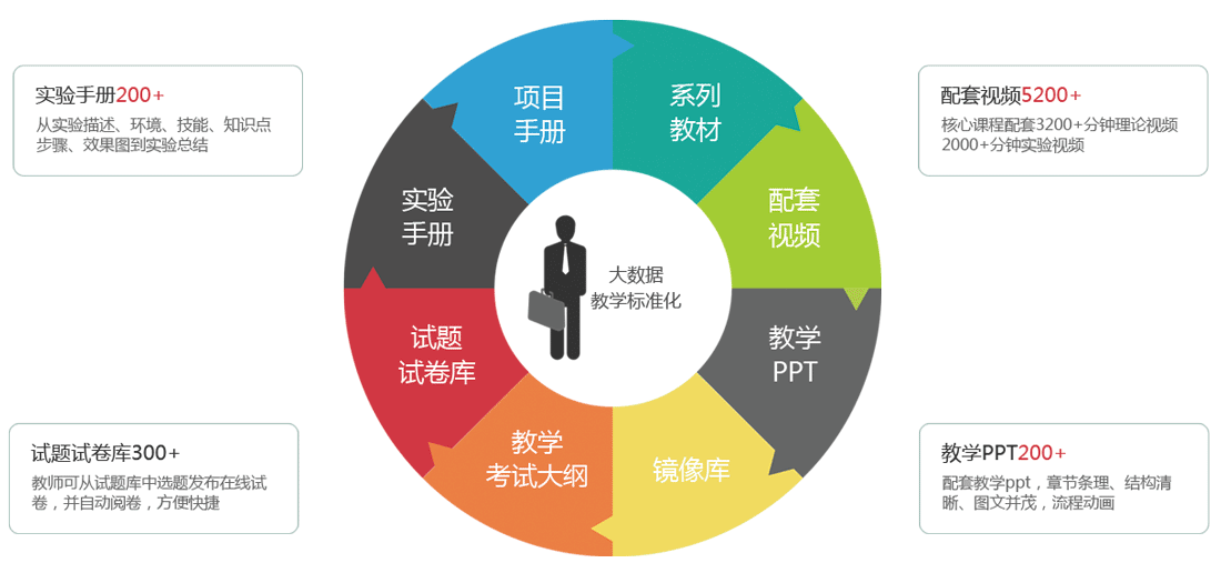 通過在線學習、原理驗證、案例實驗、綜合分析及自主設計等多層次實驗操作,為大數據教學提供一個完整一體化實驗教學體系,快速提升實操技能,最終培養高素質、應用復合型大數據人才。